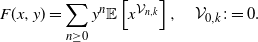 \begin{equation*}F(x,y)=\sum_{n\ge 0}y^n\Bbb E\left[x^{\mathcal V_{n,k}}\right],\quad \mathcal V_{0,k}:=0.\end{equation*}