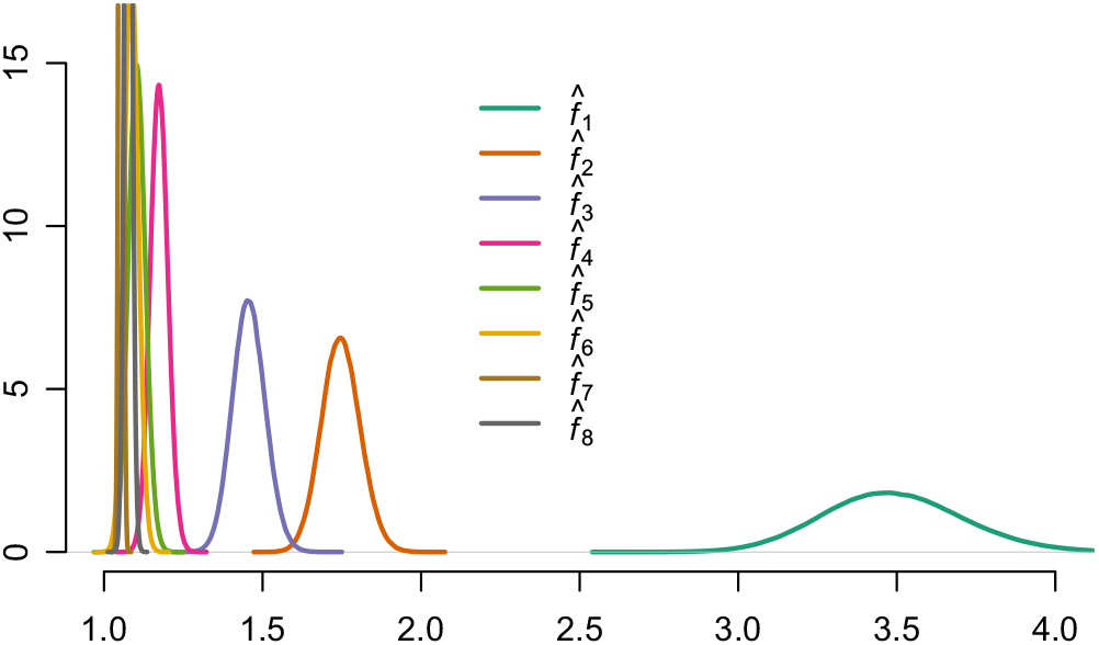 Figure A.4. (Colour online) Kernel density estimators of the estimators of the development factors. Some density curves are cut in order to make it easier to visually discriminate between the development factors centred close to 1.