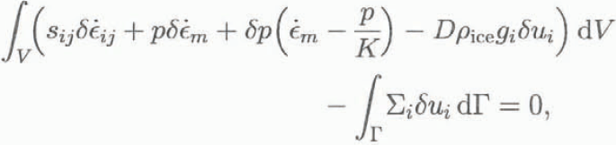 This formulation, used by Duva and Crow (1994), is not suited for our problem since we have to deal with both compressible firn and incompressible ice. To overcome this difficulty we adopted a mixed (velocity-pressure) formulation, based on the application of the virtual work principle, in which compressibility Equation (8) is enforced by using the pressure as a Lagrange multiplier. Among all admissible velocity fields, the solution of the flow problem is such that