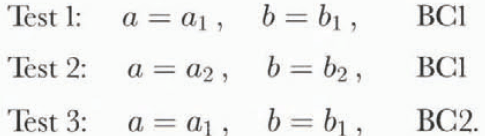 Three sets of results, tests 1, 2 and 3, are presented. They were achieved by using expressions (a 1, b 1) or (a 2, b 2), given by Equations (15) and (16), respectively, for functions a and b, and by prescribing the lateral boundary condition as BC1 or BC2, namely: