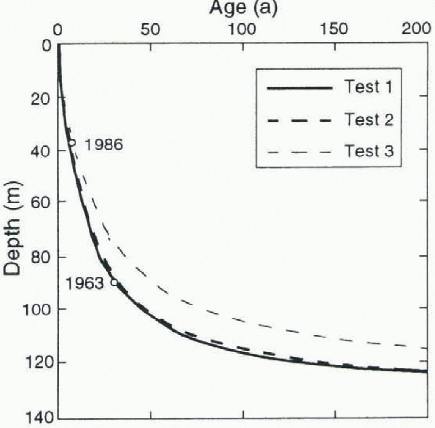The age of the ice vs depth along the borehole 2 vertical, computed with the same value B = 20 MPa–3 a–1 for the three tests, is shown in Figure 3. The test 3 curve computed with B = 31 MPa–3 a–1, not shown in the figure, is superposed on the test 1 and 2 curves. Thus the age of the ice seems tobe independent of the test conditions.