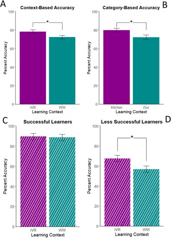 Figure 2. Effects of learning context, category, and individual differences. (A) There was an overall significant difference between immersive VR (iVR) vs. non-VR associative learning (WW, word-to-word association); (B) there was a significant difference between learning in Kitchen vs. learning in Zoo (both in iVR conditions); (C) there was no significant effect of learning context for Successful Learners; and (D) there was a significant effect of learning context for Less Successful Learners, with significantly higher accuracy in the iVR compared to the WW condition. Error bars indicate 95% confidence intervals and * indicates significant effect (based on Legault et al., Reference Legault, Zhao, Chi, Chen, Klippel and Li2019a).