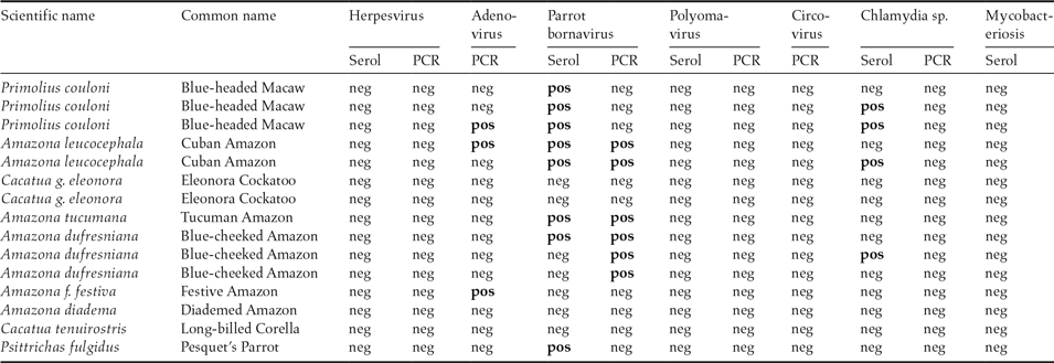 Table 2. Scientific and common name of 15 parrots from the same institution transferred on July 11, 2012 to Giessen University, Germany. Results from serological and PCR examinations for different pathogens.
