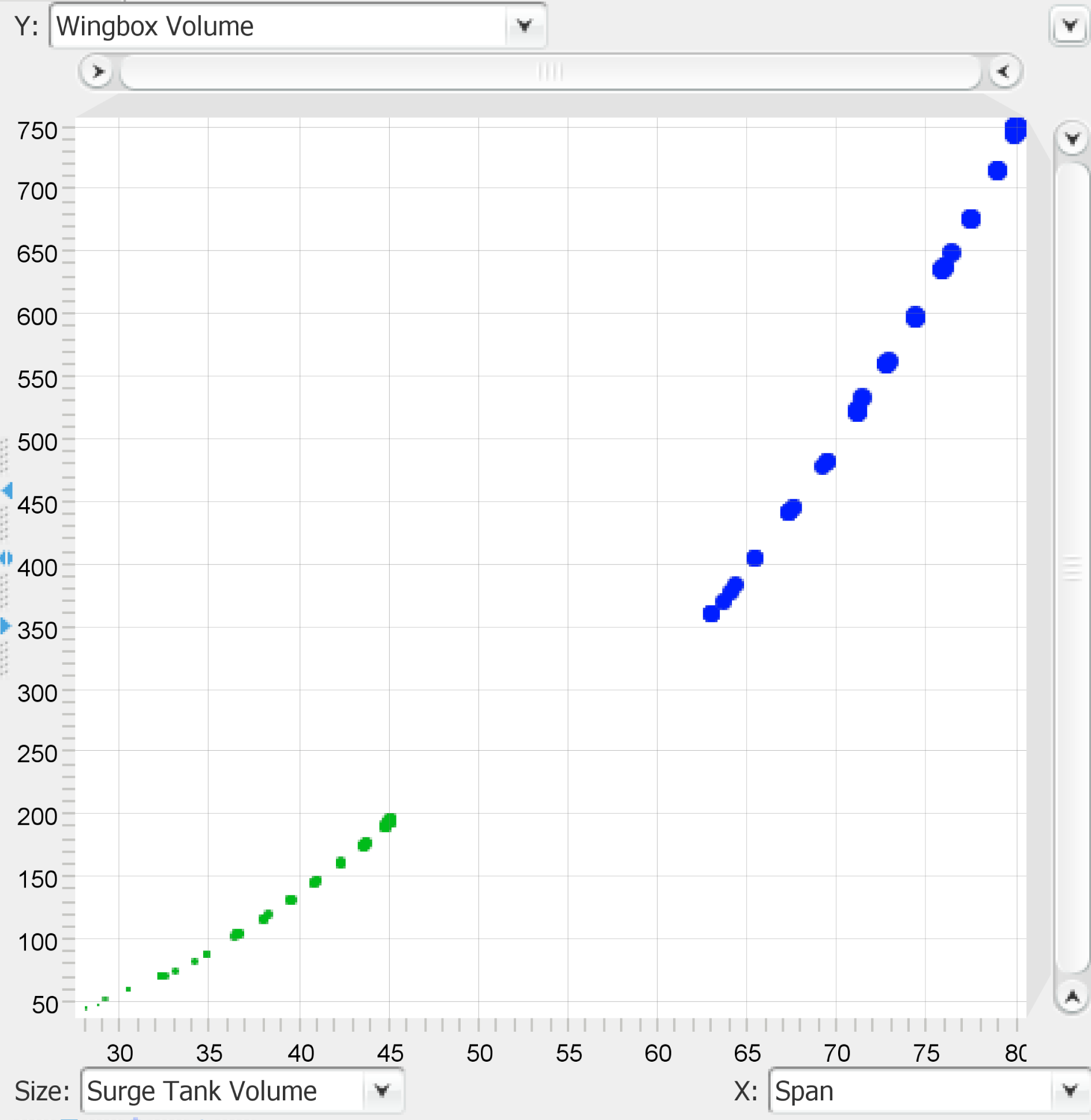 The size of the points in the above scatterplot is dependent on the size of the surge tank volume. Besides the wingbox volume, the surge tank volume also increases with span; this demonstrates the trade-off when dealing with competing objectives in multiobjective optimisation.