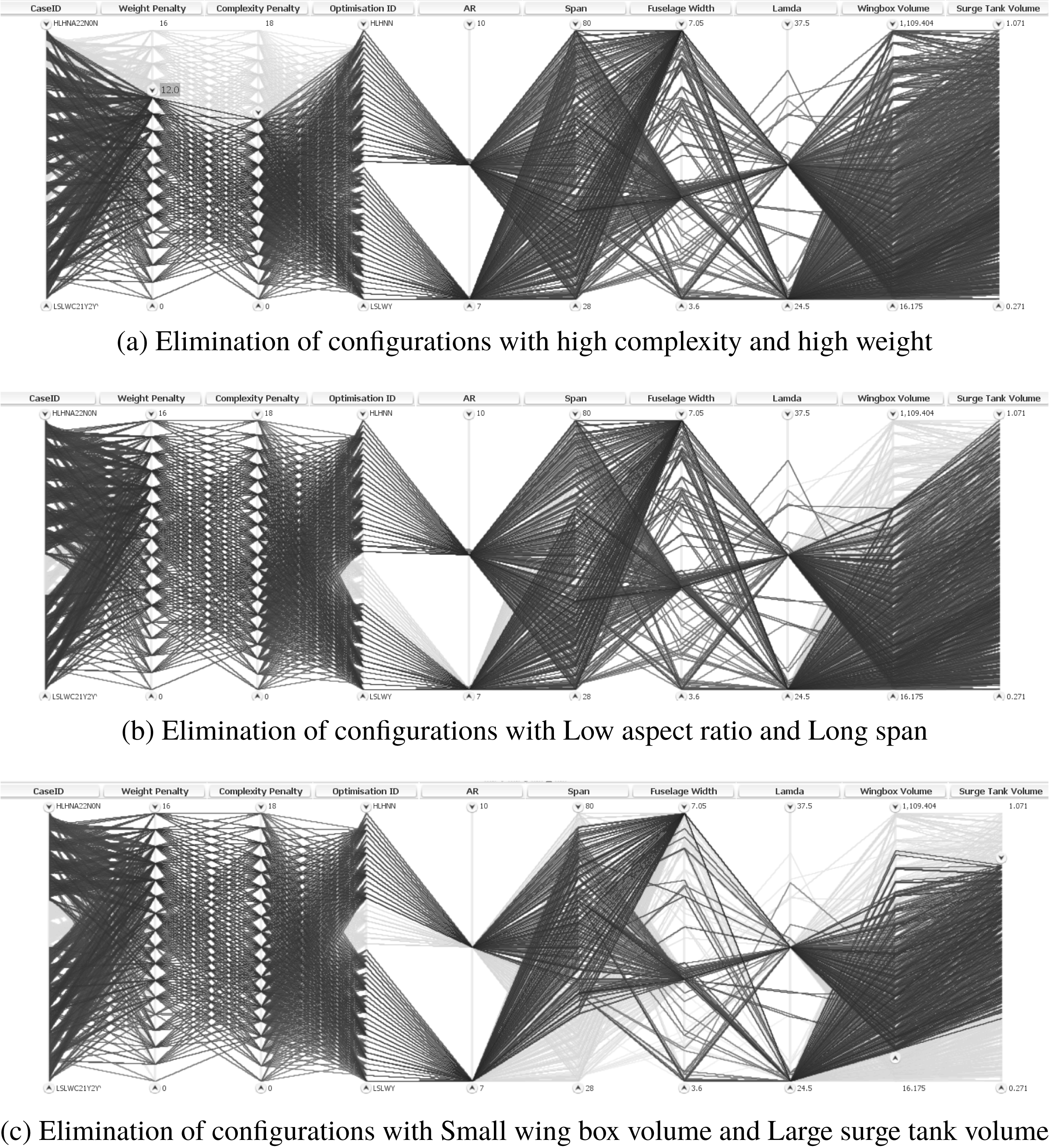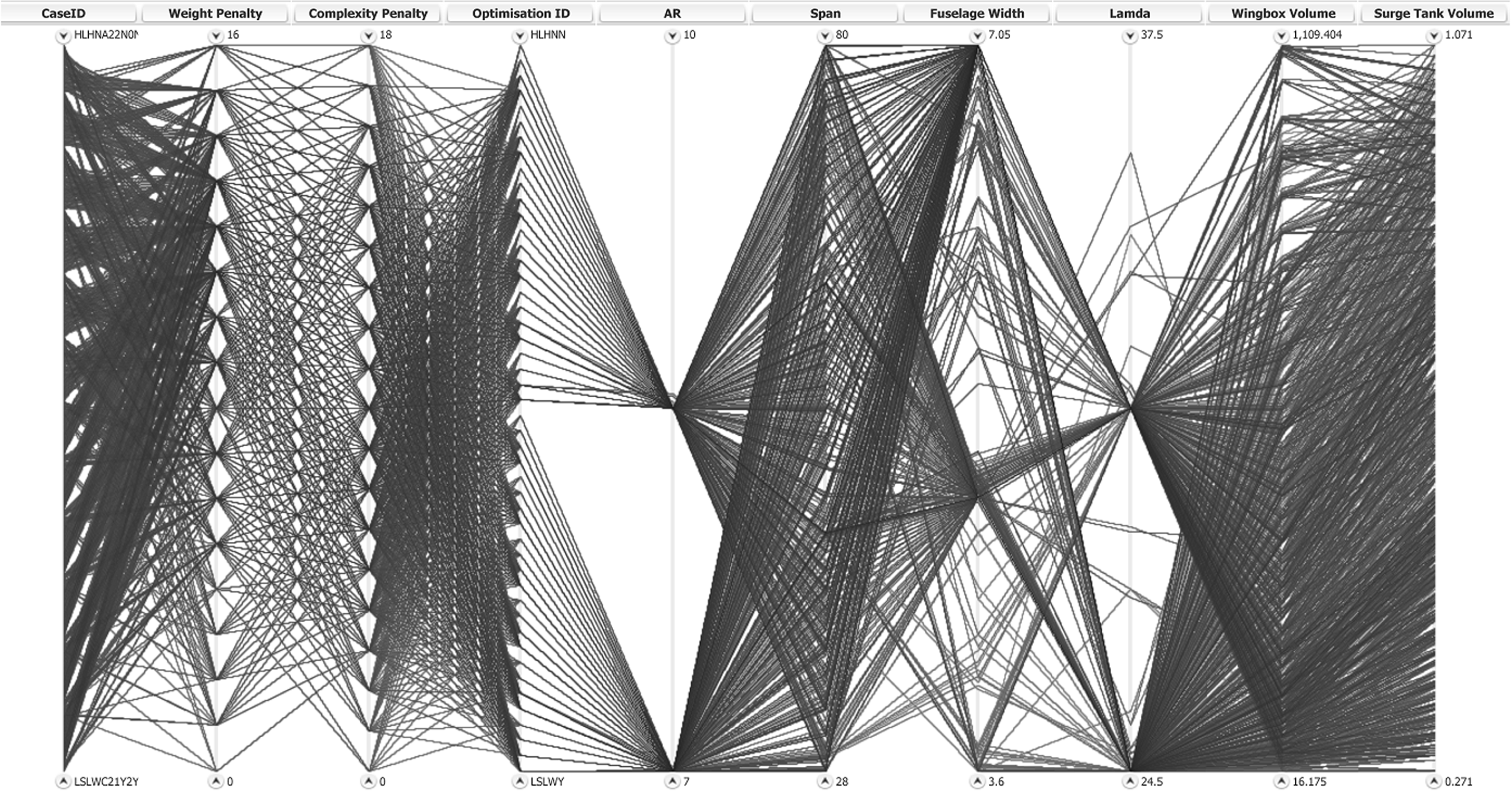 In order to examine the relationship between span and the two objectives, the axes of the parallel coordinates graph can be rearranged as required. Figure 15 shows the relationship between span, wingbox volume, and surge tank volume.