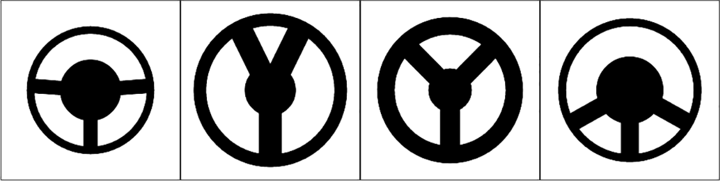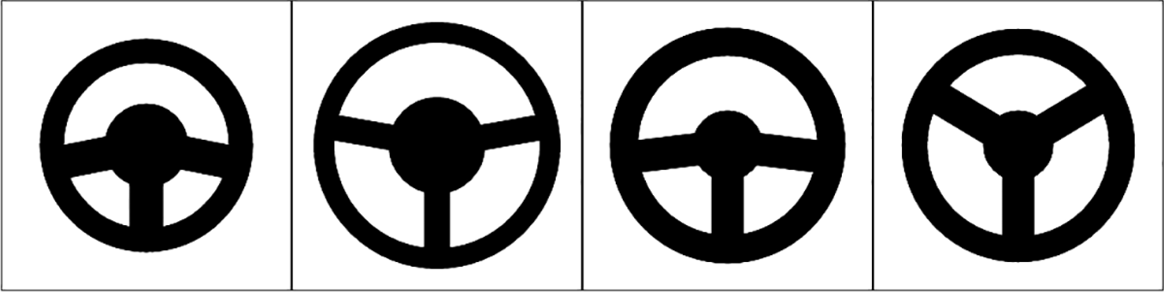 A steering wheel was redesigned using ABIGA. The steering wheel was modeled with five design parameters (see Figure 4) and five affordances given by the authors. It should be noted that the affordances shown in Table 2 are not the entire set of affordances needed to design the steering wheel. Other affordances are involved that cannot be evaluated by users, especially AAAs; for example, the affordances related to the steering shaft (if there is one at all) and the rack and pinion system. The designer needs to select a set of relevant affordances that users can evaluate and that will have an impact on the form of the product. The experiment was carried out twice. Two different groups of six users were involved in the assessment of design solutions. The initial population had 50 solutions; all subsequent generations had a population of 10 solutions each. Users were only instructed to access the web application with its URL. The stopping criterion for the IGA was the number of generations, which was set at 15 generations in both experiments based on Nguyen et al.’s reported results with a similar design problem (Nguyen et al. Reference Nguyen, Guarneri, Fadel and Mata2012).