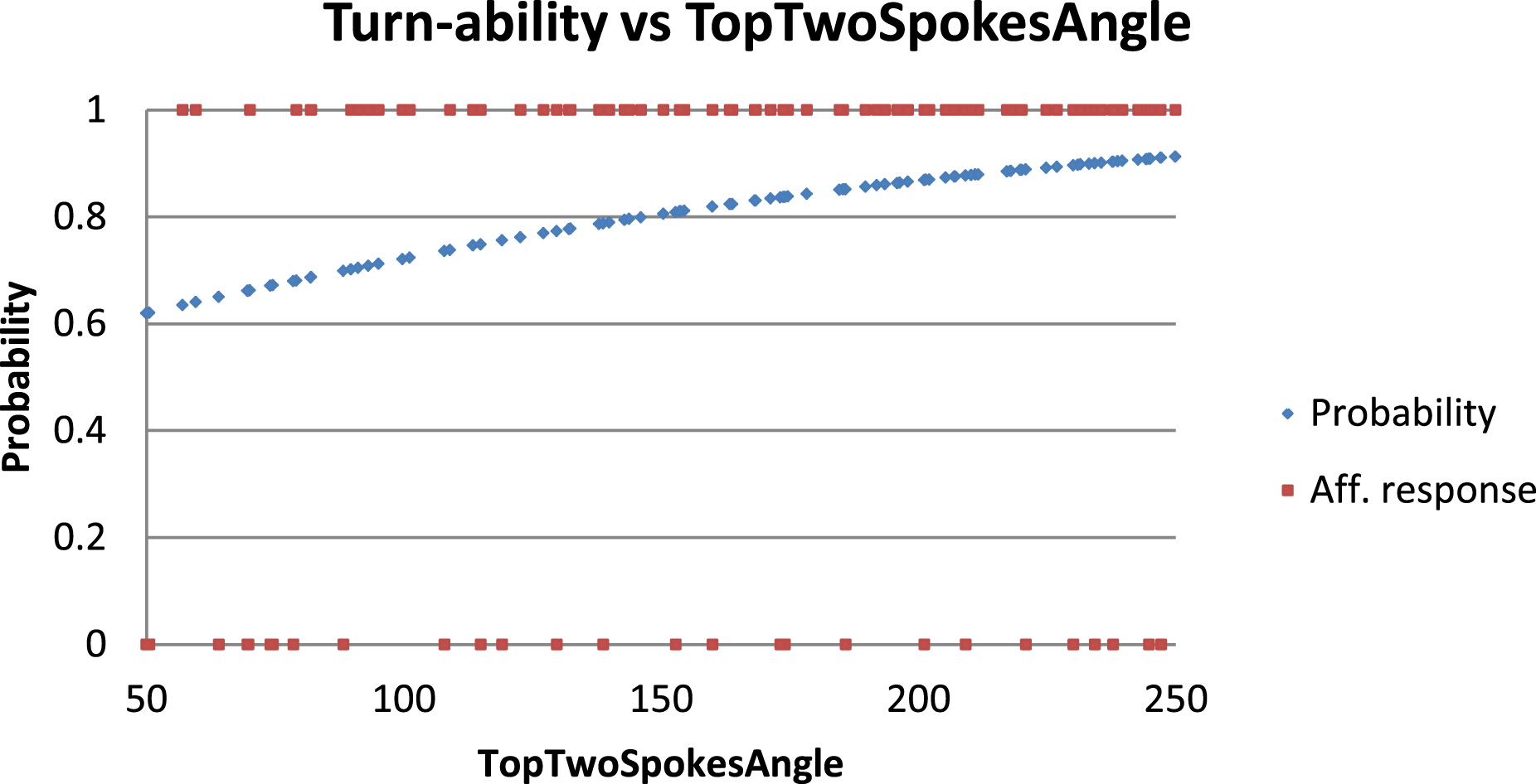 Figure 12. Turn-ability versus TopTwoSpokesAngle; experiment 2.