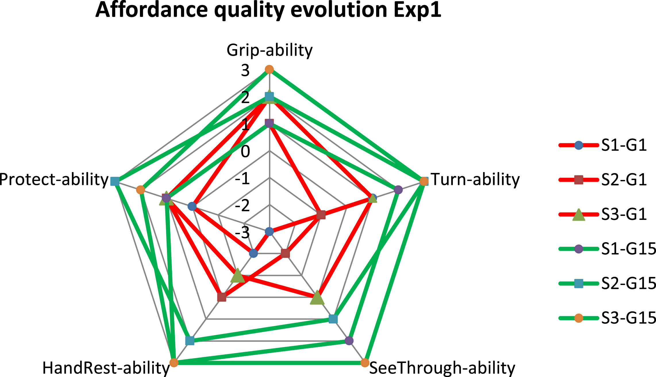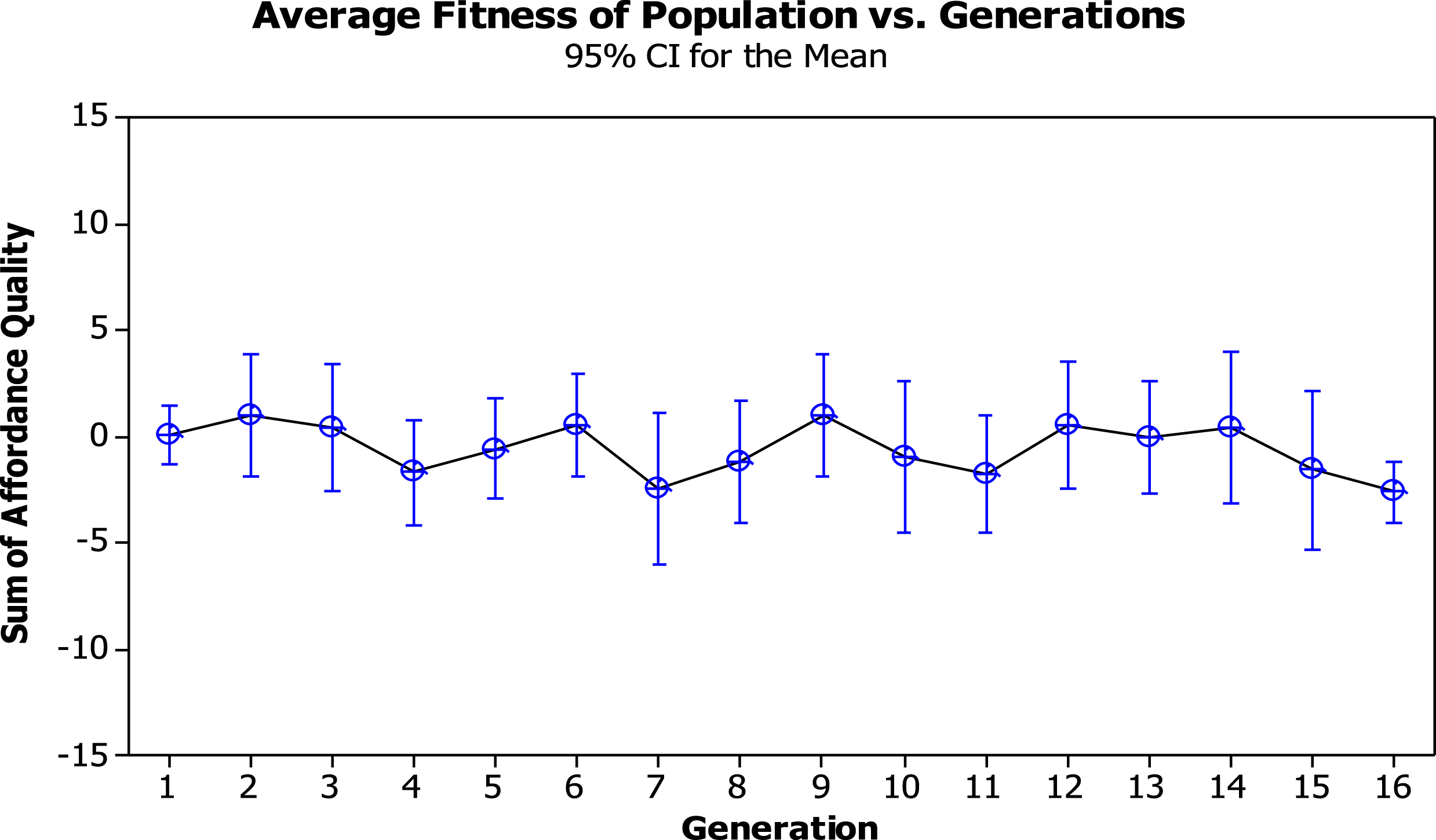 The graphs show 16 generations because the first generation is the initial population, which also has to be evaluated by users. The maximum value possible for the overall fitness is 15, as there were five affordances, each of which could have a maximum value of three. The minimum value is