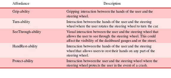 The advantage of using affordances is that they can be easily assessed by users (due to the quality property) to determine, for example, optimal product forms. Of course, not all affordances can be assessed by users. For example, users would not be able to assess the affordances related to the rack and pinion system of a steering wheel to turn the car, simply because they cannot ‘perceive’ this system when using a steering wheel. However, users would be able to assess the turn-ability of a steering wheel, which encompasses other affordances. For example, users might be able to perceive a difference between an assisted rack and pinion system (power steering) and a non-assisted system. Even though they do not directly assess the artifact–artifact affordances (AAAs), the effects of these systems can be assessed through the turn-ability affordance (an AUA). The benefit of using the ABD framework in this scenario is the ability to synthesize the results of users’ evaluations of the product through the evaluation of AUAs.