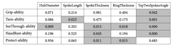 -value is less than 0.05, then there is evidence that the design parameter contributes to the prediction of the affordance quality outcome. The significant values are highlighted in the tables.