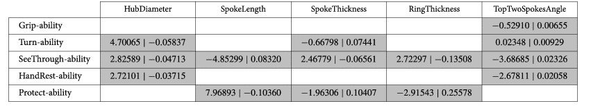 As is expected in multicriteria problems, there are always tradeoffs, which means that there is no perfect solution. Because of this, there is no single solution that will be preferred by all users. Therefore, it does not make sense for the designer to expect to use specific design parameter values obtained from ABIGA in their design. After all, we would not expect that a quarter degree in the angle between the top two spokes of a steering wheel would make much of a difference to the perception of quality from users. It would make more sense if designers had ranges of values for each design parameter that they could work with so that whatever values were chosen would elicit good quality perceptions from the users. It turns out this is possible if the responses from the users show that there are relationships between the design parameters and the affordances of the product in question.