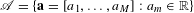 $\mathscr{A}=\{\mathbf{a}=[a_{1},\ldots ,a_{M}]:a_{m}\in \mathbb{R}\}$
