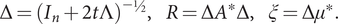 $ \Delta ={\left({I}_n+2t\Lambda \right)}^{-\frac{1}{2}},\hskip1em R=\Delta {A}^{\ast}\Delta, \hskip1em \xi =\Delta {\mu}^{\ast }. $