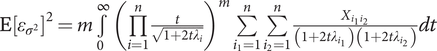 $ {\displaystyle \begin{array}{c}\mathrm{E}{\left[{\varepsilon}_{\sigma^2}\right]}^2=\sum \limits_{j=1}^m2\underset{0}{\overset{\infty }{\int }}t\left|\Delta \right|\left(\mathrm{tr}\,{R}^2\right) dt+\underset{0}{\overset{\infty }{\int }}t\left|\Delta \right|{\left(\mathrm{tr}\,R\right)}^2 dt\hskip7.9pc \\ {}=\sum \limits_{j=1}^m\underset{0}{\overset{\infty }{\int }}t\left|\Delta \right|\left(2\,\mathrm{tr}\,{R}^2+{\left(\mathrm{tr}\,R\right)}^2\right) dt\hskip21.8em \\ {}=m\underset{0}{\overset{\infty }{\int }}{\left(\prod \limits_{i=1}^n\frac{t}{\sqrt{1+2t{\lambda}_i}}\right)}^m\left(2\sum \limits_{i_1=1}^n\sum \limits_{i_2=1}^n{R}_{i_2{i}_1}{R}_{i_1{i}_2}+{\left(\sum \limits_{i_1=1}^n{R}_{i_1{i}_1}\right)}^2\right) dt\\ {}=m\underset{0}{\overset{\infty }{\int }}{\left(\prod \limits_{i=1}^n\frac{t}{\sqrt{1+2t{\lambda}_i}}\right)}^m\sum \limits_{i_1=1}^n\sum \limits_{i_2=1}^n\left(2{R}_{i_2{i}_1}{R}_{i_1{i}_2}+{R}_{i_1{i}_1}{R}_{i_2{i}_2}\right) dt\hskip2.3pc \\ {}=m\underset{0}{\overset{\infty }{\int }}{\left(\prod \limits_{i=1}^n\frac{t}{\sqrt{1+2t{\lambda}_i}}\right)}^m\sum \limits_{i_1=1}^n\sum \limits_{i_2=1}^n\frac{X_{i_1{i}_2}}{\left(1+2t{\lambda}_{i_1}\right)\left(1+2t{\lambda}_{i_2}\right)} dt,\hskip2.4pc \end{array}} $