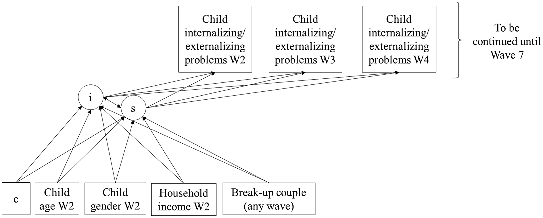 For RQ 1, we considered gender of anchor parent (W2; 0 = female, 1 = male), household income (W2), and the indicator variable for breakup couples (i.e., whether the couple separated sometime between W2 and W7; 0 = no change in partner; 1 = change(s) in partner) as covariates, since they are known correlates of interparental conflict and parent-child interaction (e.g., Conger et al., Reference Conger, Conger and Martin2010; van Dijk et al., Reference van Dijk, van der Valk, Deković and Branje2020). Household income was assessed by one item reported by anchors assessing monthly income. Responses spanned 14 income categories: 1 = under 250 Euros to 14 = 4,500 and more Euros. For RQ 2, we included child age and gender (W2; 0 = female; 1 = male), household income (W2), and the indicator variable for breakup couples as time-invariant covariates, given past research suggests that these variables affect child internalizing and externalizing problems (Lansford et al., Reference Lansford, Malone, Tapanya, Tirado, Zelli, Alampay, Al-Hassan, Bacchini, Bornstein, Chang, Deater-Deckard, Giunta, Dodge, Oburu, Pastorelli, Skinner, Sorbring and Steinberg2019; Zemp et al., Reference Zemp, Johnson and Bodenmann2019).