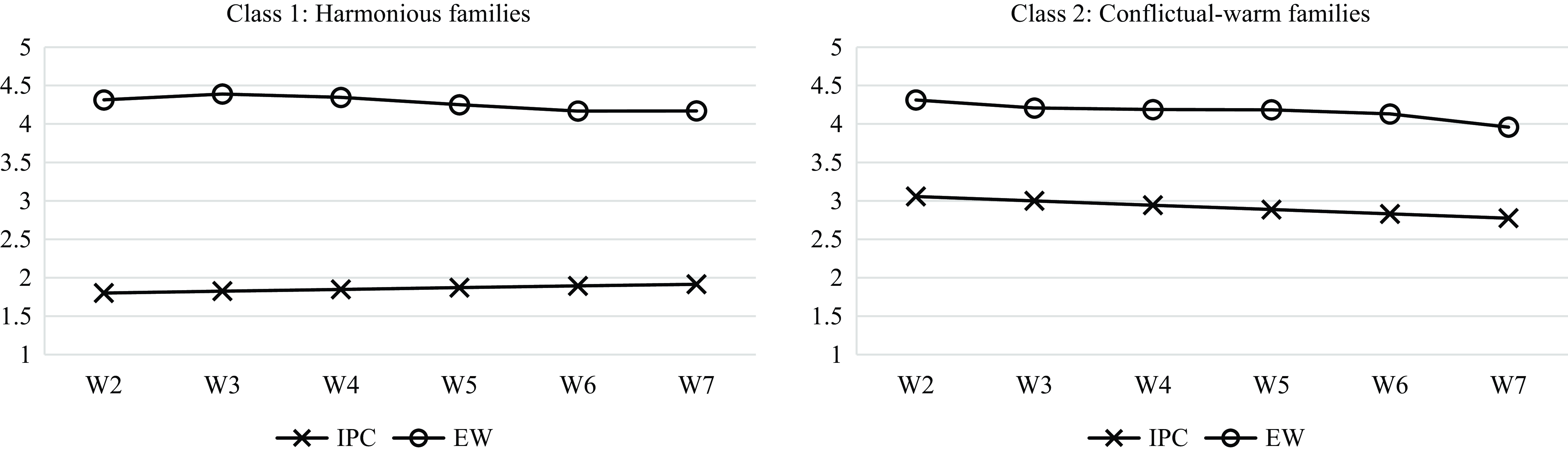 Table 1 and Figure 3 present estimated growth factor means and trajectory plots based on the final 2-class model. The larger class consisted of 80% of the sample reporting low IPC with a small increase and high EW with fluctuation (Class 1: Harmonious families). The smaller class consisted of 20% of the sample reporting moderate, decreasing IPC and high-stable EW (Class 2: Conflictual-warm families). Although there were some ups and downs in the plot of the EW trajectory for Class 2, all three slopes were not statistically significant (ps = .099–.212). Using Wald tests, we found that Class 1 and 2 had similar baseline EW at W2, but Class 2 had a significantly higher initial level of IPC at W2 than Class 1. They also differed on IPC linear slope, and EW linear, quadratic, and cubic slopes.