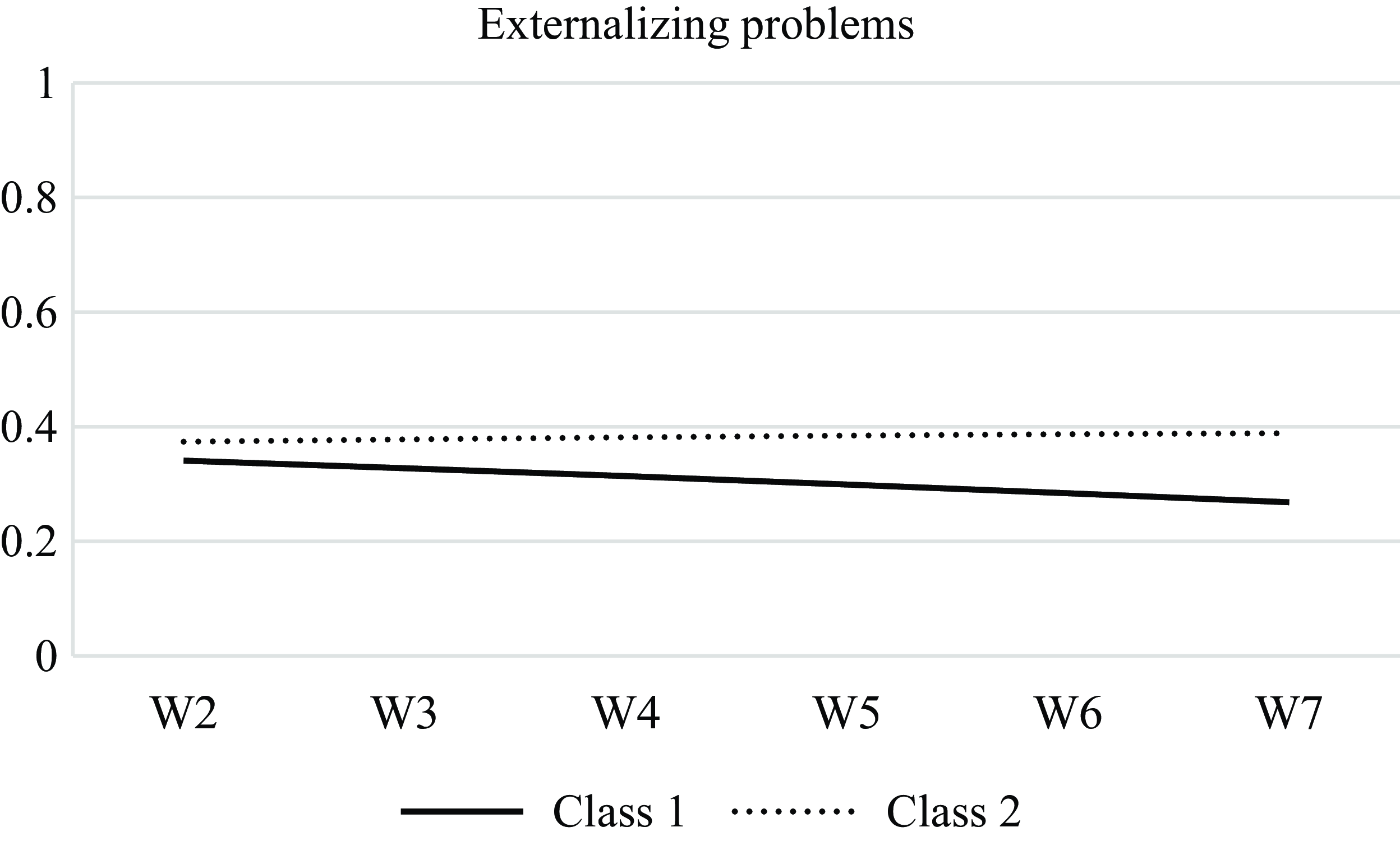 In contrast to the effects found for externalizing outcomes, we found no associations between the family profiles and children’s internalizing problems. It is conceivable that behavioral problems are particularly linked to the (different) IPC trajectories that were the main distinguishing factor between the two classes. Social learning theory (Bandura, Reference Bandura1977) postulates that children learn ways of social interaction by observing their parents. In light of destructive, verbally aggressive conflict tactics, which were central ingredients of our measure of interparental conflict, children may imitate these behaviors in other relationships and act out greater hostility and aggression towards peers and siblings (e.g., Stocker & Youngblade, Reference Stocker and Youngblade1999). These results match with prior research showing that this form of destructive interparental conflict is a more salient predictor of externalizing than internalizing problems in children (van Eldik et al., Reference van Eldik, de Haan, Parry, Davies, Luijk, Arends and Prinzie2020), even though there is no consensus on this issue (Rhoades, Reference Rhoades2008). Similar to our study, Belsky and Fearon (Reference Belsky and Fearon2004) reported that children from the “good parenting/poor marriage” profile displayed more externalizing problems, but their internalizing symptoms did not differ across profiles. Assuming bidirectional effects between family dynamics and child outcomes, there is evidence that children’s externalizing problems are more markedly associated with challenges in parenting and the interparental relationship than internalizing problems (Reitz et al., Reference Reitz, Deković and Meijer2006; Zemp et al., Reference Zemp, Johnson and Bodenmann2018). These findings indicate that the dynamic interplay between the couple relationship and parenting might be linked with some features of child development in unique ways, although we expect that this may vary depending on the age and gender of the child. We controlled for these child characteristics in our analysis and found that older children reported lower initial levels of externalizing problems and less steep declines in internalizing problems than younger children. Additionally, relative to boys, girls were more likely to report higher initial levels of internalizing problems. These effects fit in well with the current knowledge of developmental psychopathology in the general population (Kjeldsen et al., Reference Kjeldsen, Nes, Sanson, Ystrom and Karevold2021; Sterba et al., Reference Sterba, Prinstein and Cox2007), but future studies should investigate the interactions between child demographics and family trajectory profiles more precisely.