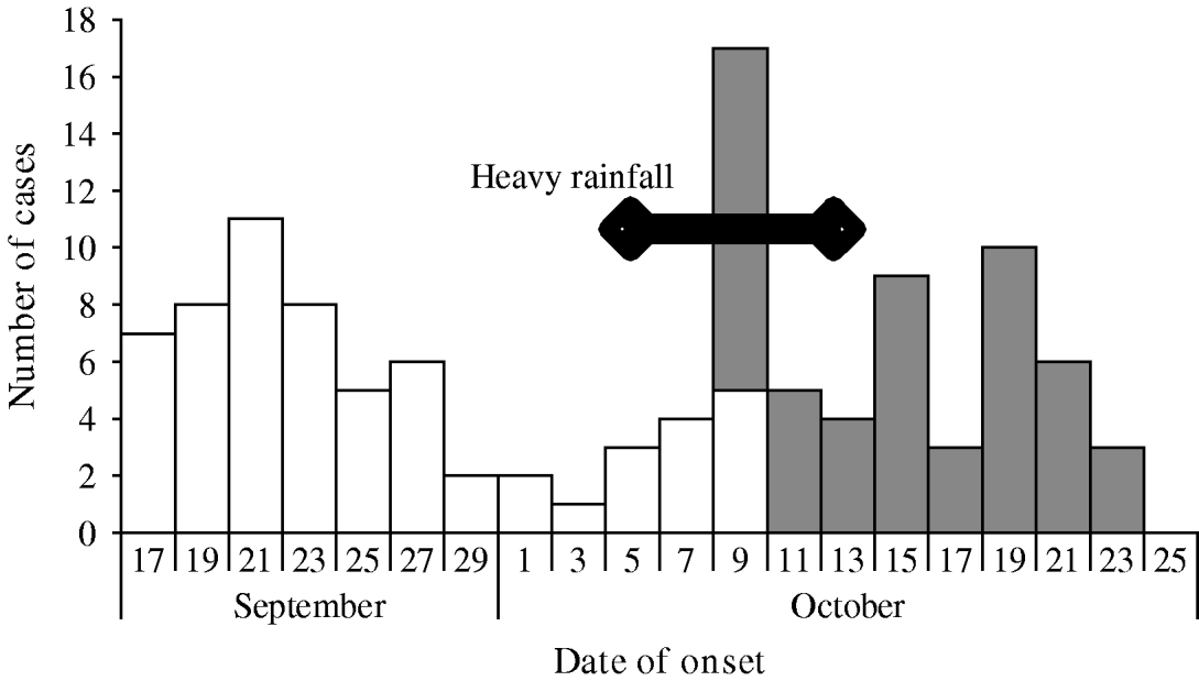 The time sequence between the two outbreaks suggested that the second outbreak might have been a consequence of the first. A sewerage drain collecting the wastewater from Chasapada village (the first village) ran parallel to a road (Fig. 1). That drain did not have a proper terminal disposal system and ended in close proximity to an irrigation canal that flowed towards Tentulipatna, the second village. On 6 October, roadwork labourers blocked the drain and destroyed the embankment of the canal for renovation of the nearby road, causing the sewerage water to accumulate. Heavy rainfall between 6 and 13 October caused the drain to overflow. It then contaminated the canal that flowed towards Tentulipatna located 5 km away. In the second village, the canal passed by the implicated well from which it was only 2 m apart. That well was unprotected and did not have any brim or platform.