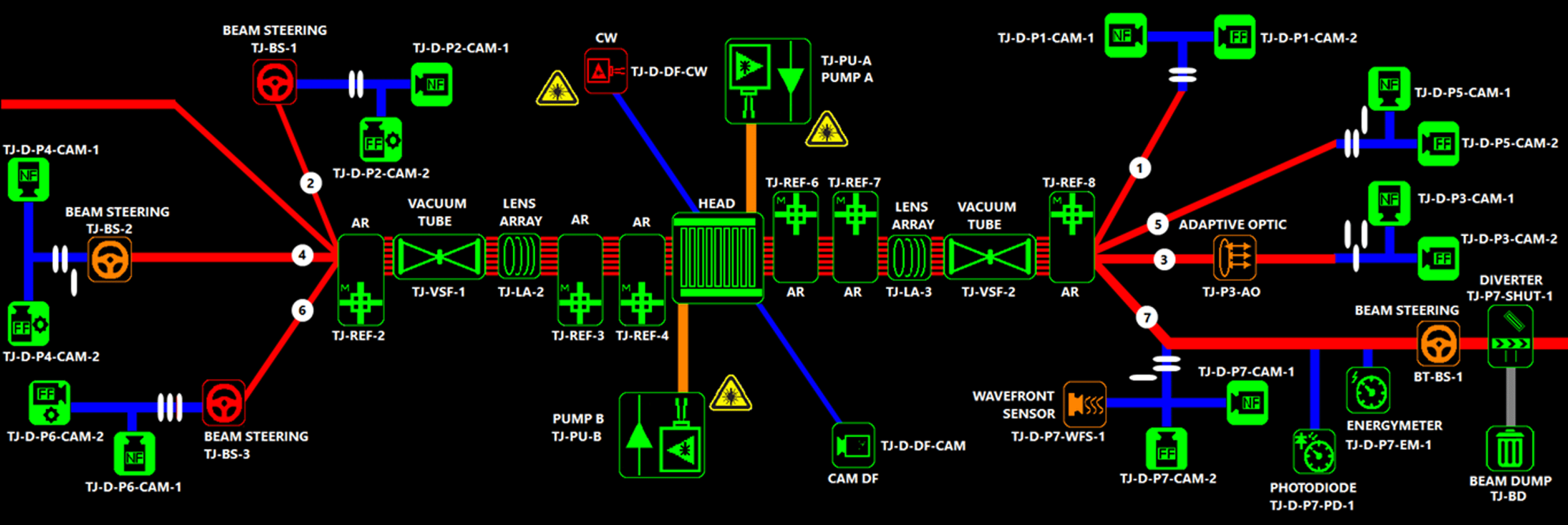 Figure 11. Synoptic screen for control and monitoring of 10 J cryo-preamplifier. Red lines correspond to the main 1030 nm laser beam path, input from the FE (left) and output to the beam transport section (right); blue lines represent diagnostic beam paths; and orange lines correspond to 940 nm pump diode beam paths.