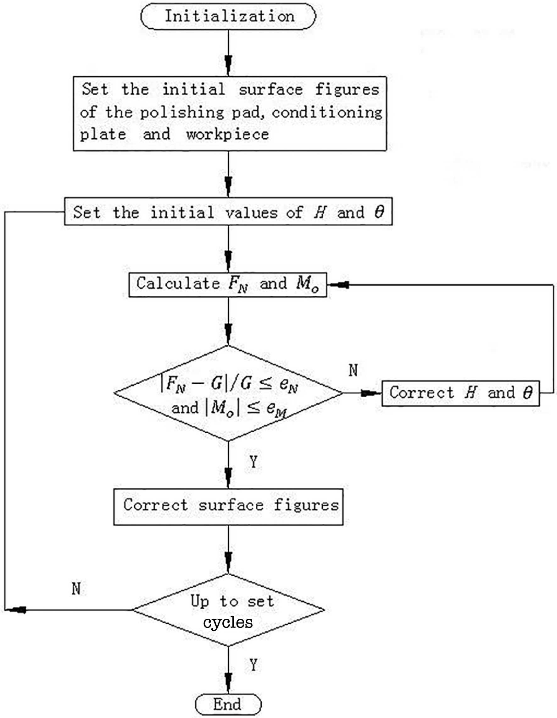 The initialization includes every size of the lap, conditioning disk and workpiece, the position and density of the conditioning disk and workpiece, Young’s modulus of the lap, the Preston constants and rotation number, calculation errors, increments for