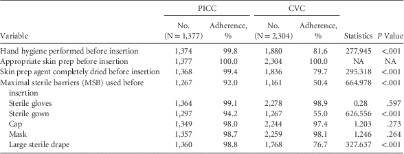NOTE. CLIP, central-line insertion practices; PICC, peripherally inserted central catheter; CVC, central venous catheter; NA, not available; Statistics, Pearson Chi-square test.