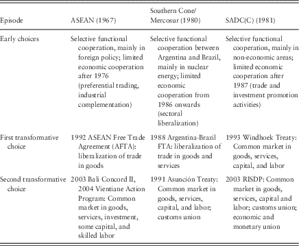 In this section, drawing on interviews, primary documents, and secondary sources, I seek to demonstrate the plausibility of the frame diffusion argument with reference to economic cooperation in ASEAN, the Southern Cone/Mercosur, and SADC. I focus primarily on those key institutional choices when the three regional organizations decided to move beyond a simple FTA to embrace a common market, in line with the main puzzle outlined before. Transformative choices involving the adoption of an FTA will be dealt with only briefly. In line with the theoretical argument, the narratives show that the adoption of the common market frame correlates temporally with (1) an explicit turn towards community building as a major purpose of the organization and (2) the emergence of cooperation problems that had been theorized by a given problem–response schema. More broadly, the narratives indicate how the influence of the common market frame in regional decision-making guided actors across different structural contexts towards the adoption of similar objectives in the process of regional economic cooperation.
