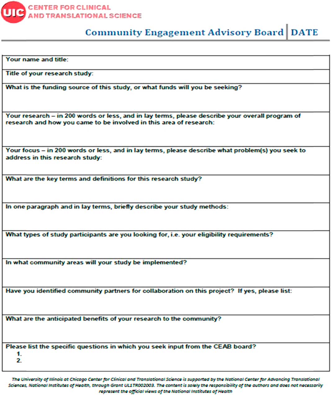 Since inception, the National Institutes of Health Clinical and Translational Science Award programs have placed a priority on community engagement. The establishment of innovative and effective approaches to support capacity building for academic and community partners is essential to the realization of the benefits of community involvement. The consultation service developed by the UIC CTSA has demonstrated the benefits of CEAB consultations for researchers. Our model can be used to inform the development of future CEAB boards at other CCTS locations.