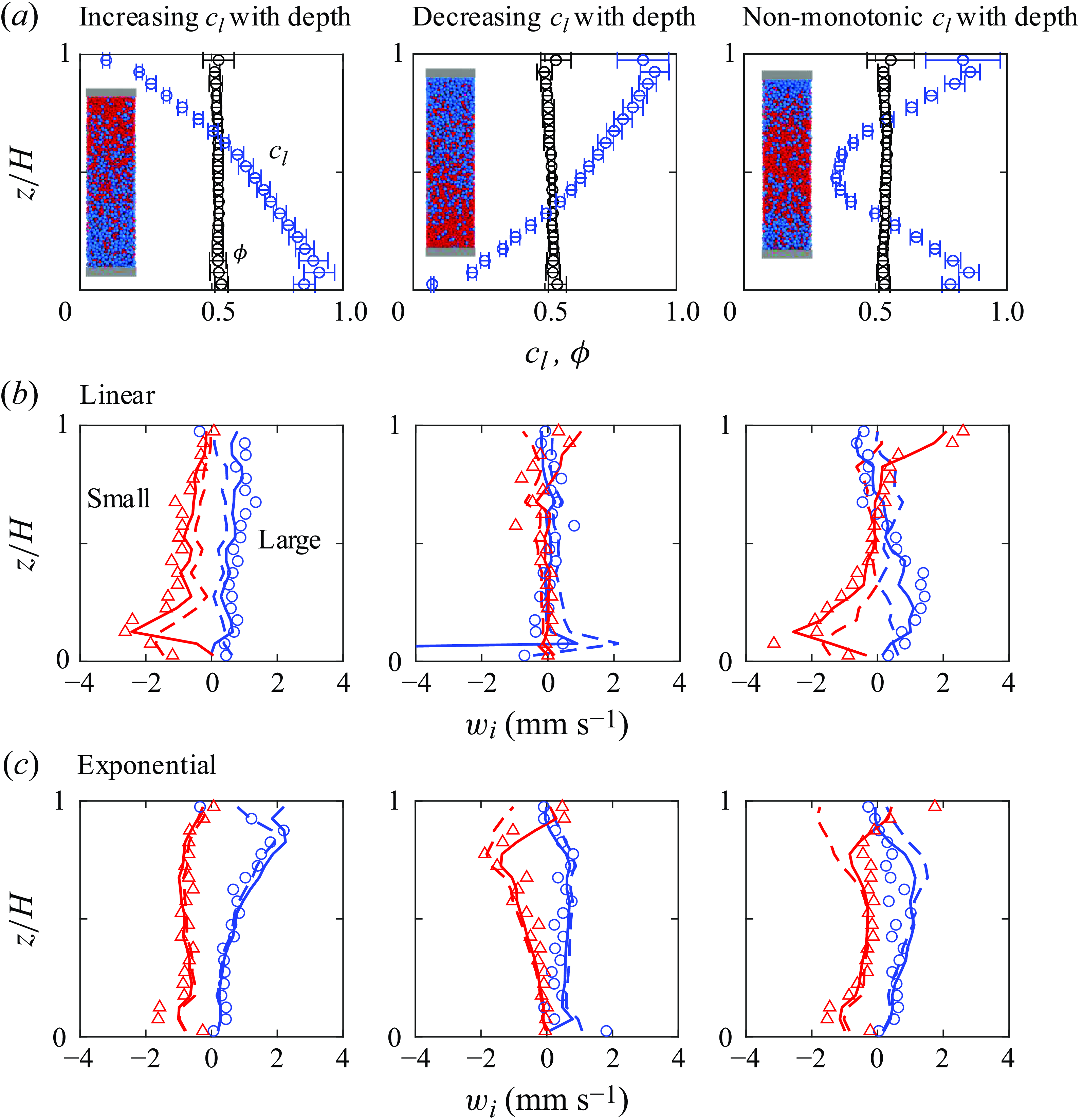 high layers (shading) for characterising depth-varying segregation velocity. Here, large particles rise while small particles sink. The segregation direction varies in the different flow configurations analysed later. (b) Force balances on a large particle and a small particle corresponding to (2.1) and species-specific vertical segregation velocities,