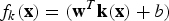(14) $$\eqalign{ {\bf w}&=\sum^m_{i=1}\alpha_iy^{(i)}{\bf k}({\bf x}^{(i)}), \cr b&=\displaystyle{{\max_{i:y^{(i)}=-1}({\bf w}^T{\bf k}({\bf x}^{(i)}))+\min_{i:y^{(i)}=1}({\bf w}^T{\bf k}({\bf x}^{(i)}))}\over{2}}}$$