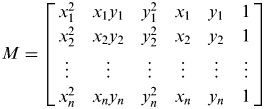 $M = \left[ \openup 2pt{\matrix{ {x_1^2} & {x_1 y_1} & {y_1^2} & {x_1} & {y_1} & 1 \cr {x_2^2} & {x_2 y_2} & {y_2^2} & {x_2} & {y_2} & 1 \cr \vdots & \vdots & \vdots & \vdots & \vdots & \vdots \cr {x_n^2} & {x_n y_n} & {y_n^2} & {x_n} & {y_n} & 1 \cr}} \right]$, then these linear equations can be simplified into the following form: