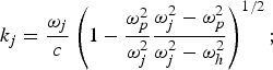 $k_j = \displaystyle{{{\rm \omega} _j } \over c}\left({1 - \displaystyle{{{\rm \omega} _p^2 } \over {{\rm \omega} _j^2 }}\displaystyle{{{\rm \omega} _j^2 - {\rm \omega} _p^2 } \over {{\rm \omega} _j^2 - {\rm \omega} _h^2 }}} \right)^{1/2}; $a 0 is the beam width parameter of lasers, ωh2 = ωp2 + ωc2, ωp2 = 4πn 0e 2/m and ωc = eB 0/m are upper hybrid frequency, electron plasma frequency, and cyclotron frequency, respectively; −e and m are the electronic charge and mass; and εjzz = [1 − ωp2/(ωj2 − ωc2)] & εjzy = −i[ωcωp2/ωj(ωj2 − ωc2)] are components of the dielectric tensor εj. Extraordinary mode or x-mode is the natural electromagnetic mode of magnetized plasma.