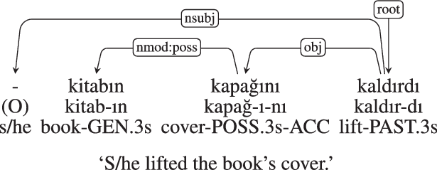 In Turkish, morphology is agglutinating. Syntactic information is encoded in inflectional morphemes, which are suffixed to the word. An example is given in Figure 1. In the example, -ı in kapağ-ı-nı indicates possession, which is an inflection. It also reveals that its host word is a nominal. It is in a possessive dependency relation with “book.”