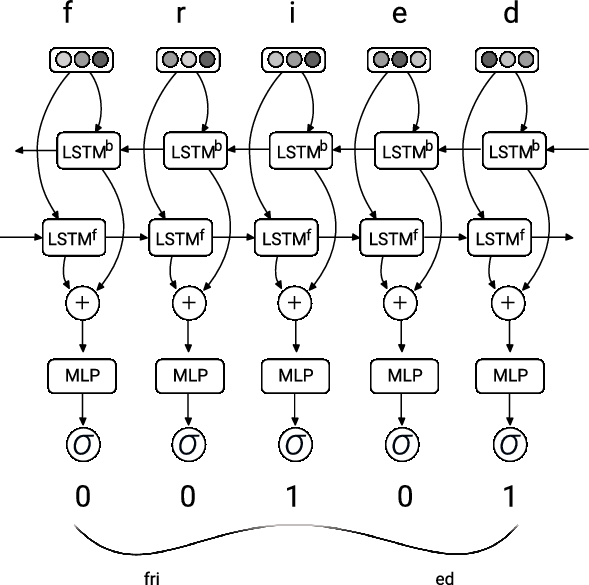 character in the word. MLP has one sigmoid output that predicts whether there is a segment boundary at a time step. 1 indicates that there is a segment boundary after the character and 0 indicates that the word will not be split at that point.