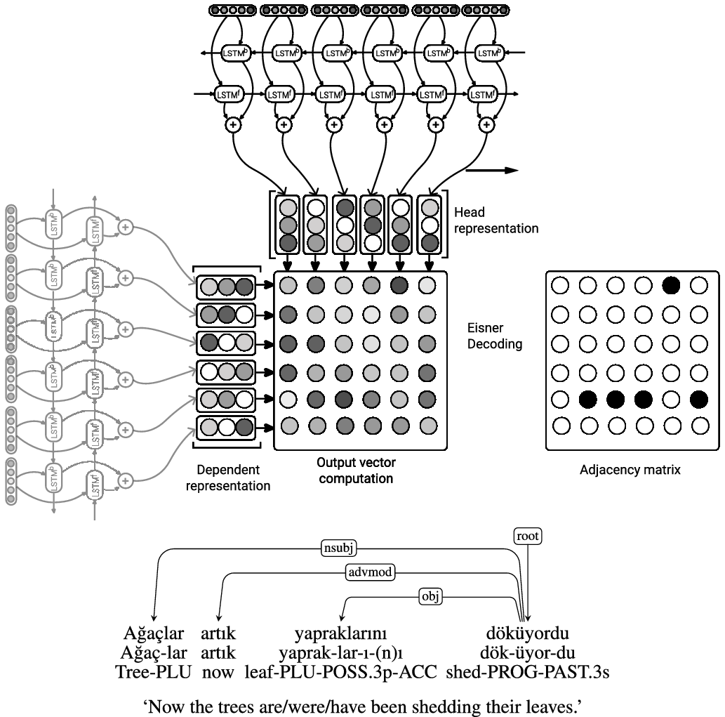 We represent distributional meaning in terms of neural vector representations that help to learn some underlying form of a sentence. We use neural character and morpheme representations to learn the word representations for learning POS tags and dependency relations between words. In learning morphological segmentation of words, we aim to obtain a word representation based on morphemes. Recent work shows that representations that are learned from words as separate tokens are not good enough to capture the syntactic and semantic information of words in agglutinating languages because of severe sparsity. Character-level or morpheme-level representations lead to a better prediction of embeddings in such languages (e.g., Üstün, Kurfalı, and Can Reference Üstün, Kurfal and Can2018). Vania and Lopez (Reference Vania and Lopez2017) provide a comparison of word representations. Their results confirm that although character-level embeddings are effective for many languages, they do not perform as well as the models with explicit morphological information. We use both character and morpheme representations in learning POS tags and dependencies.