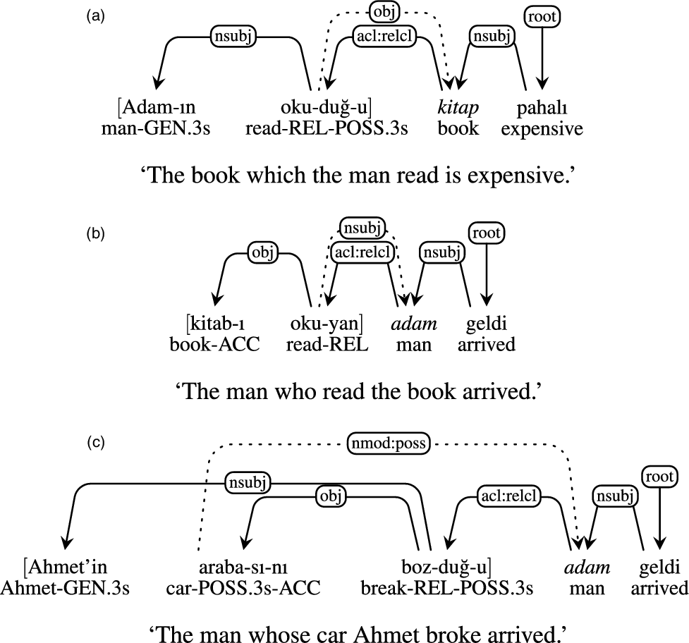 Figure 9. Dependencies in Turkish relative clauses (in brackets), and with the relativized noun (in italic). They are (a) root-clause object relativization; (b) root-clause subject relativization; (c) relativization out of possessive NPs, here from “man’s car”: “adam-GEN.3s araba-POSS.3s.” Dotted edges indicate which dependency relation “acl:rel” dependency is expected to capture.