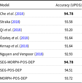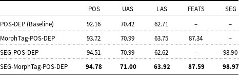 Ours being the first attempt to combine five tasks in a single joint model, we compare the performance of each component separately with different models. Results of dependency parsing are in Table 2. The table shows the UAS and LAS scores of different dependency parsing models. We compare our results with the joint POS tagging and dependency parsing model by Nguyen and Verspoor (Reference Nguyen and Verspoor2018), with the winning contribution to CoNLL 2018 shared task that incorporates deep contextualized word embeddings (Che et al. Reference Che, Liu, Wang, Zheng and Liu2018), with the horizontal pipeline system that performs tokenization, word segmentation, POS tagging, and dependency parsing by Qi et al. (Reference Qi, Dozat, Zhang and Manning2018), with the tree-stack LSTM model by Kırnap, Dayanık, and Yuret (Reference Kırnap, Dayanık and Yuret2018), and with the dependency parser that incorporates morphology-based word embeddings proposed by Özateş et al. (2018).