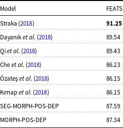 The comparison of our morphological tagging results (FEATS) with other models is given in Table 4. We compare our model with Straka (Reference Straka2018), Dayanık et al. (Reference Dayanık, Akyürek and Yuret2018), Che et al. (Reference Che, Liu, Wang, Zheng and Liu2018), Qi et al. (Reference Qi, Dozat, Zhang and Manning2018), Özateş et al. (Reference Özateş, Özgür, Gungor and Öztürk2018), and Kırnap et al. (Reference Kırnap, Dayanık and Yuret2018). The best performing model is by Straka (Reference Straka2018) with an accuracy of 91.25%. It is worth mentioning that none of these models performs a joint learning for morphological tagging. Our model is the only joint model that performs morphological tagging along with other syntactic tasks. The results are very competitive with other models although they fall slightly behind them.