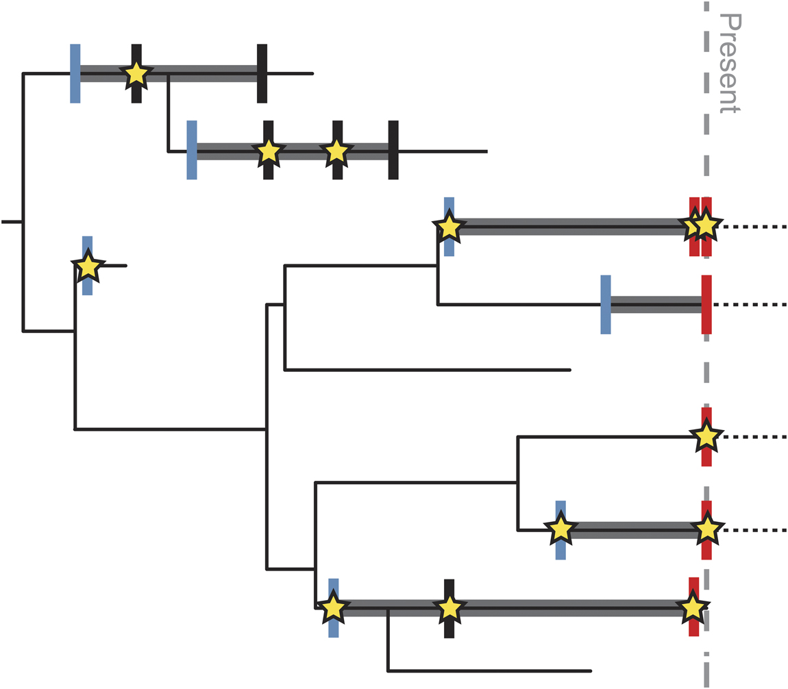 Figure 2 Schematic showing potential variation in “points of observation” for different types of data. Thin black line shows complete evolutionary history of a clade. Thick gray lines represent known stratigraphic range based on the fossil record. Dashed black lines represent range extension of living taxa into the future (it is currently unknown when the last occurrence will be). Blue vertical lines mark points of observation for discrete character data describing a species. Because all individuals of the species share these characters, they must be expressed by the time of the first occurrence of the species. Red vertical lines mark points of observation for molecular data; these are tied to the age of the sampled specimen, almost always at the present, except for rare samples from ancient DNA. Black vertical lines mark additional points in the stratigraphic range where species have been sampled. Stars mark points of observation for continuous morphological data, which are tied to the age of the measured specimen sampled from that part of the stratigraphic range. There may be more than one such specimen within the stratigraphic range of the species, and the age of the measured specimen(s) may not be coincident with the first or last occurrence of the species. Although vertical lines and stars are represented as “points” in time, each has an uncertainty associated with it based on the resolution of the fossil record and age model (see Fig. 1).