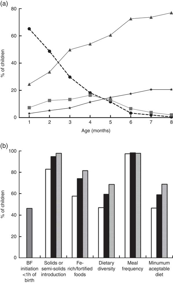Fig. 1 Breast-feeding patterns* and WHO core indicators on infant and young child feeding† in the Brazilian MAL-ED cohort site (n 233): (a) breast-feeding practices from 1 to 8 months of age (, exclusive breast-feeding;
