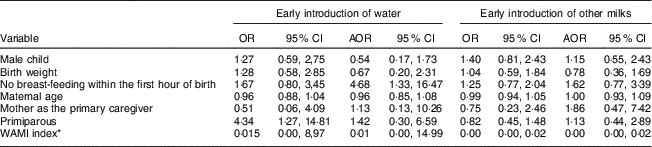Table 2 shows that no breast-feeding initiation within the first hour of birth was a risk factor for the introduction of water before 6 months of age (AOR=4·68; 95 % CI 1·33, 16·47). The WAMI index was inversely associated with the introduction of other milks before 6 months of age (AOR=0·00; 95 % CI 0·00, 0·02), with each increase of 0·01 in the WAMI index reducing the risk of early introduction of other milks by 100 %.