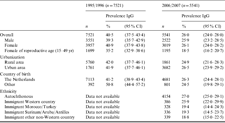 Table 1. PrevalenceFootnote * of Toxoplasma gondii antibodies in the first national serum bank in 1995/1996 and in the second national serum bank in 2006/2007, stratified for gender, degree of urbanization, being born in The Netherlands, and ethnicity