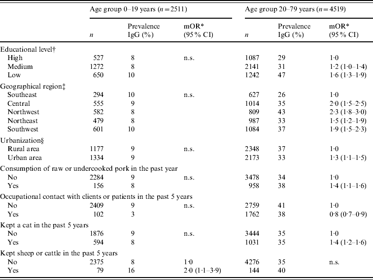 Table 2. Uncorrected prevalence of specific antibodies to Toxoplasma gondii (%) and multivariate logistic regression analyses of risk factors associated with seropositivity in participants aged 0–19 and 20–79 years