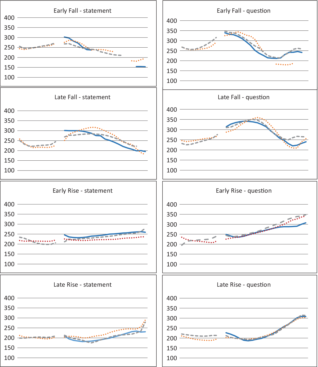Durations of the 24 selected source utterances are given in Table 3. On average, words in questions are 27% longer than in statements, while the duration of the sonorant onsets ([l] and [m]) tends to be longer as their rhymes are shorter (Pearson’s r = −0.64). Pitch contours of the recorded words that were used as the source utterances for the continua are shown in Figure 2, with declarative intonations on the left. The syllable [lyy] tends to differentiate Early Fall and Late Fall on the basis of peak alignment rather than fall alignment of the sort shown for [dee] and [mae].