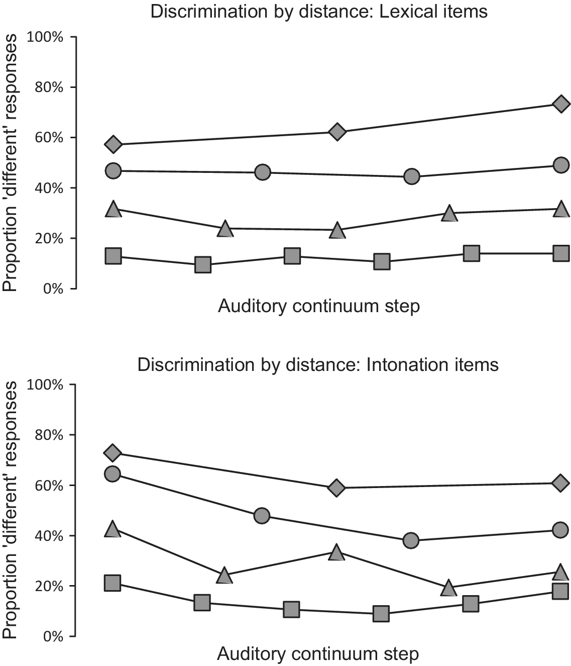 Since discrimination experiments typically yield a non-linear discrimination function for categorical contrasts, with more ‘different’ responses near the perceptual category boundary, we applied the same analysis on the (45 × 144 =) 6,480 scores as for the identification experiment, including the dependent variable response (Same/Different) and the same independent variables as for the identification experiment, in addition to step difference (step difference between the two stimuli in a trial).