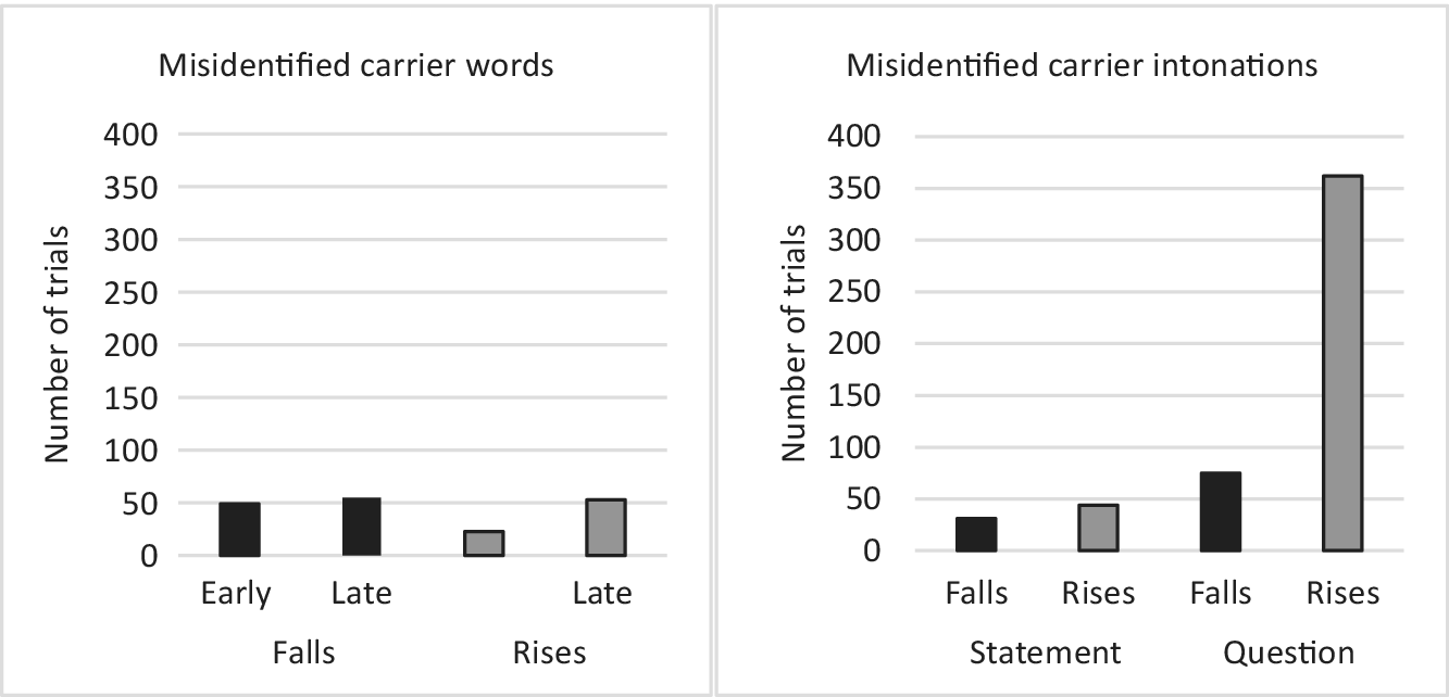 A second difference between the two groups concerns the intra-group performance difference for type of contrast. For the Zhumadian participants, tones are more robustly identifiable and discriminable than intonations. This is shown by the larger number of misidentified carrier intonations than misidentified carrier words (see Figure 5). Additionally, the interaction between step and type of contrast in the Zhumadian identification scores shows how participants are less good at identifying question intonations, with scores at the question end not showing the same near-floor results as the near-ceiling results at the statement end (Figure 6, interrupted graphs in both panels), or than those for the lexical tone continua generally (Figure 6, uninterrupted graphs, both panels). This replicates earlier findings of the perceptual vulnerability of Mandarin question intonation in adults and children (Connell, Hogan, & Rozsypal, Reference Connell, Hogan and Rozsypal1983; Singh & Chee, Reference Singh and Chee2016; Xu & Mok, Reference Xu and Mok2014), including the specific interaction of this vulnerability with lexical pitch movement direction, with rising tones increasing the vulnerability (Liu, Chen, & Schiller, Reference Liu, Chen and Schiller2016; Yuan, Reference Yuan2011). The overall better identifiability of stimuli from the tone continua does not appear to be attributable to a generalizable phonetic effect, because in the control group we found neither a main effect for type of contrast nor an interaction with step.