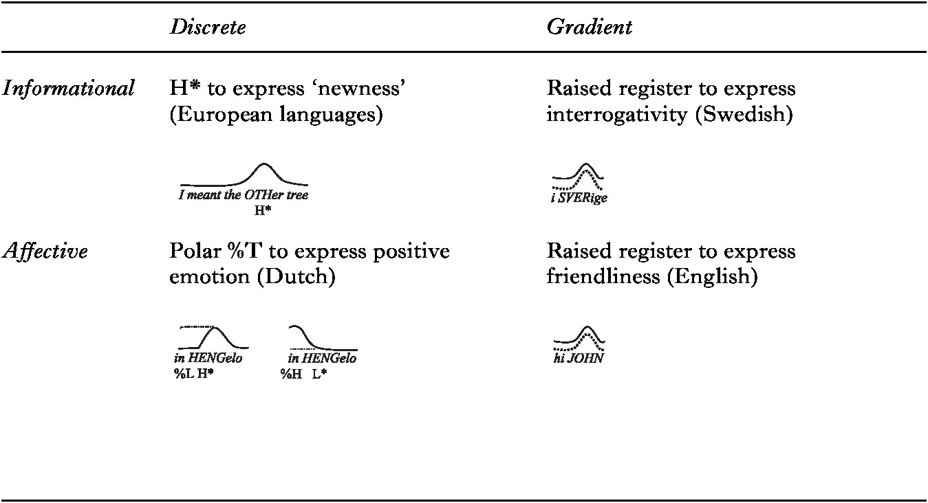 While distinguishing between these two aspects of the speaker’s knowledge of their language’s sound structure is widely seen as a central analytical task (Ladd, Reference Ladd2008 [1996], p. 39; Gussenhoven, Reference Gussenhoven2004, Ch. 5; Prieto, Reference Prieto, Cohn, Fougeron and Huffman2012), this must not lead us to think that discrete features are somehow more central to linguistics than gradient ones, a view that is likely to be bound up with the belief that linguistic meanings are necessarily morphemic, i.e., represented phonologically, and that gradience is reserved for expressing the speaker’s emotions or evaluations in relation to the linguistic message (e.g., Weitz, Reference Weitz1979, p. 94). Intonation research has shown that this position is false. Bruce (Reference Bruce1977, p. 137) found that sentence modalities in Stockholm Swedish involve adjustments of the f0 baseline, implying that the register raising as used for questions is gradient. That is, gradience in intonation is not confined to ‘affective’ meanings (meanings applying to the speaker), and may include ‘informational’ meanings (meanings applying to the message) (Grice & Baumann, Reference Grice, Baumann, Trouvain and Gut2007; Gussenhoven, Reference Gussenhoven2004; Prieto, Reference Prieto2015). In Table 1, ‘informational’ is used for what has also been called ‘logical’, from Monroy (Reference Monroy, Butler, de los Ángeles Gómez González and Doval-Suárez2005), credited to Bally (Reference Bally1935), and, more widely, ‘propositional’ or ‘linguistic’. Unsurprisingly, informational meanings are vastly more likely to be morphemic than affective meanings, as exemplified by widely reported focus-marking functions of pitch accents (e.g., Ladd Reference Ladd2008 [1996], p. 213). Similarly, gradiently expressed affective meanings, like register raising to express a positive disposition to the hearer (Chen, Gussenhoven, & Rietveld, Reference Chen, Gussenhoven and Rietveld2004), is commonplace. But the meaning and form dimensions are ultimately independent: gradient emphasis may occur in languages that lack formal means of encoding focus, just as interrogativity may be expressed gradiently in intonation. As for discretely expressed affective meaning, a claim for a morpheme with affective meaning has been made for a polar boundary tone in Dutch, which expresses positive affective meanings if its value is opposite to the upcoming tone of a pitch accent (Grabe, Gussenhoven, Haan, Marsi, & Post, Reference Grabe, Gussenhoven, Haan, Marsi and Post1998; Gussenhoven, Reference Gussenhoven2004, p. 88) (see Table 1).