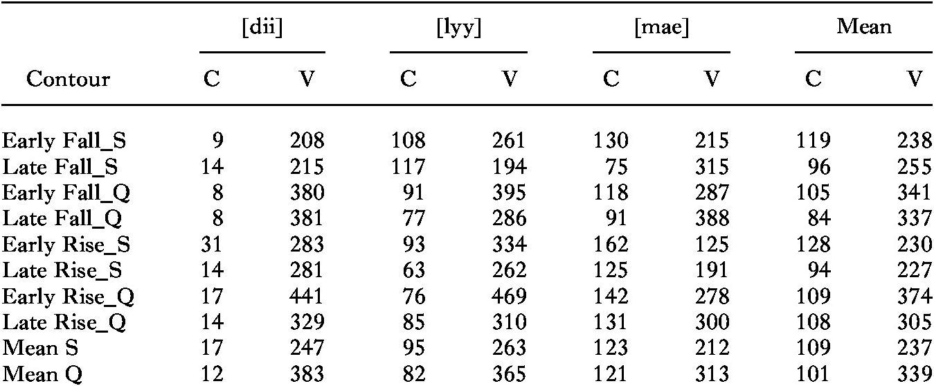 Table 3. Durations of onsets (C) and rhymes (V) of the selected statement and question pronunciations of the words in Table 2. In the case of [dii], the duration is the VOT, the closure phase of [d] being voiceless.