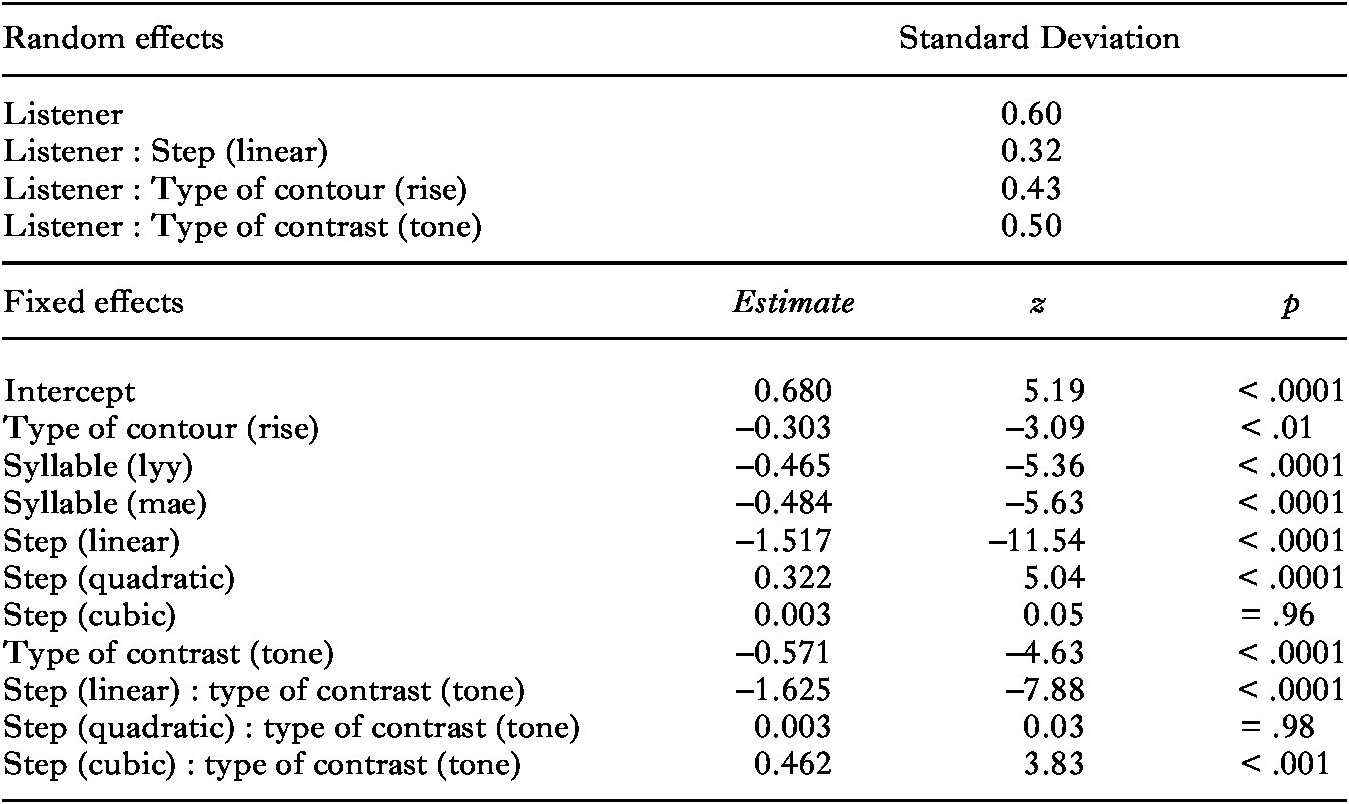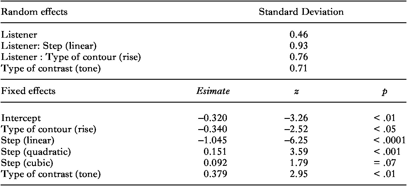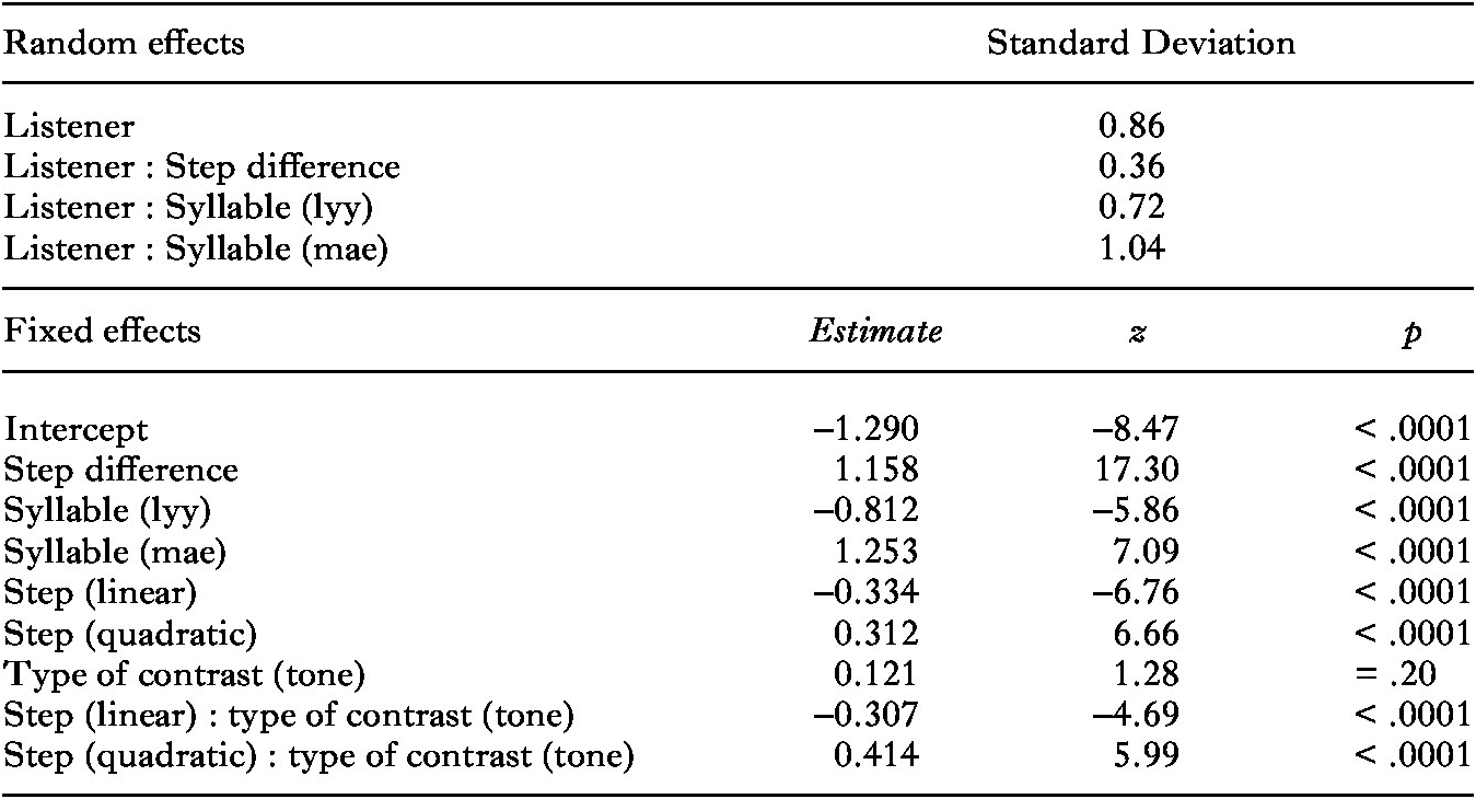 Table 6. Results of the logistic mixed-effects regression analysis for the Indonesian pitch discrimination experiment (0 = Same, 1 = Different)