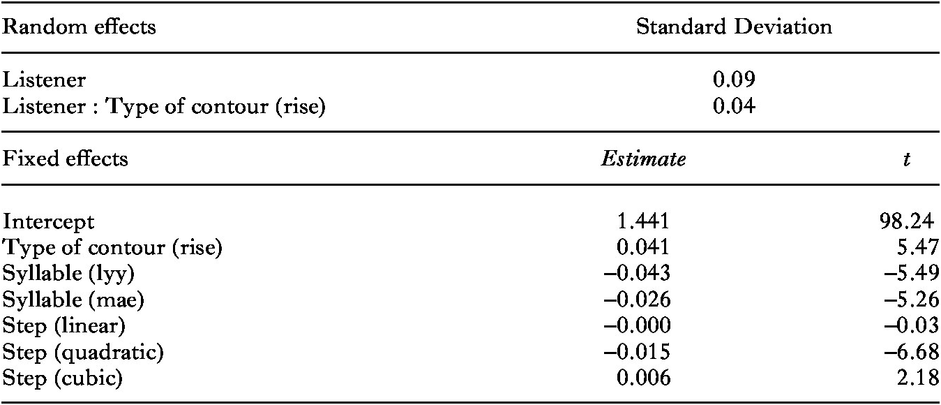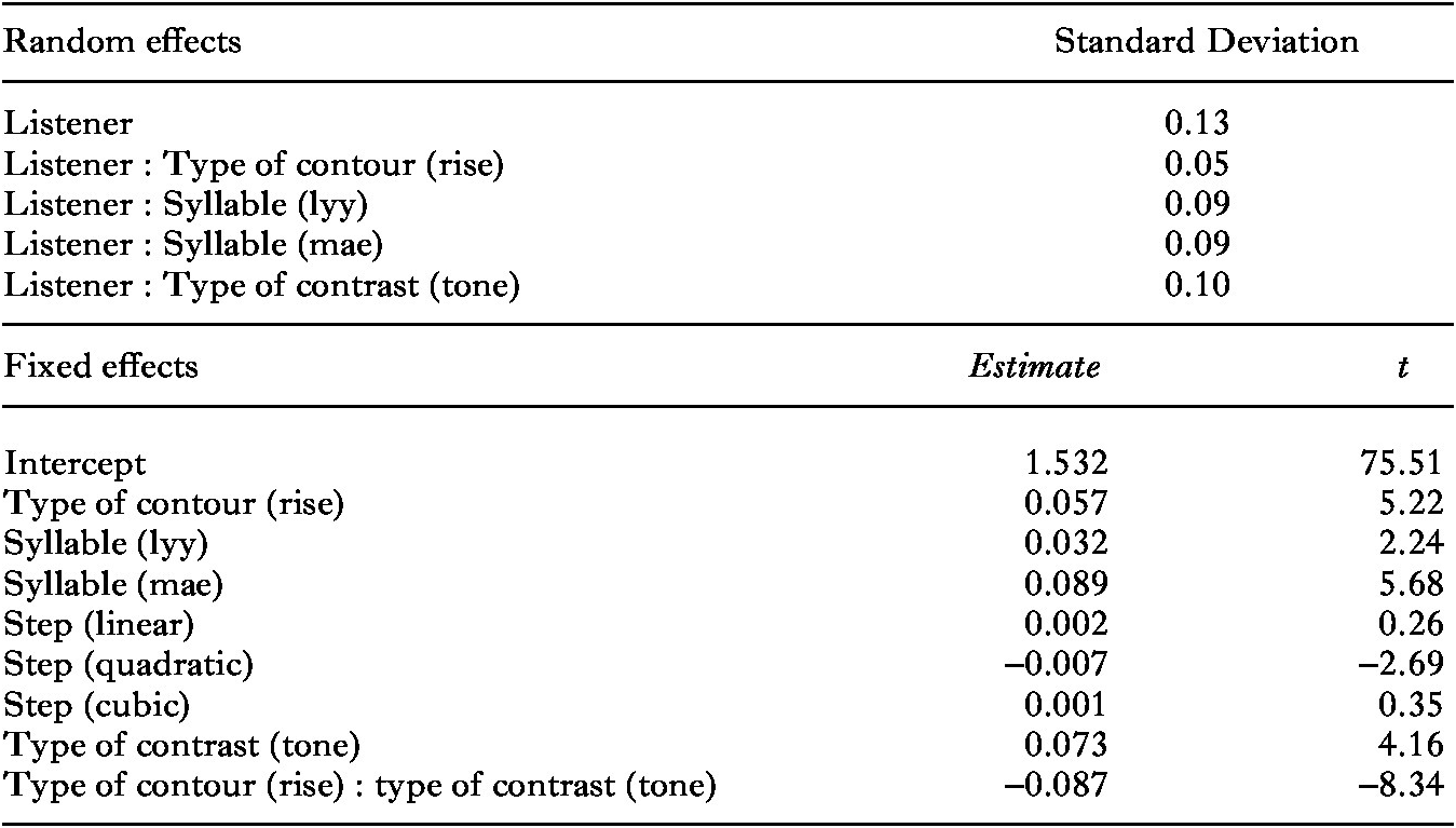 Table 5 shows a main effect of syllable, indicating slower RTs for words with [lyy] and [mae] than those with [dii], the only syllable that agrees with Indonesian phonology, which probably explains the faster processing by these participants of stimuli with that syllable. An interaction between type of contour and type of contrast indicated that falling stimuli in the intonation continua were processed faster than rises and falls in the tone continua, possibly due to their similarity to falling pitch in the stimuli in the intonation continua. There was also a main effect of the quadratic term of step, which showed somewhat faster RTs near the extremes of the continua.