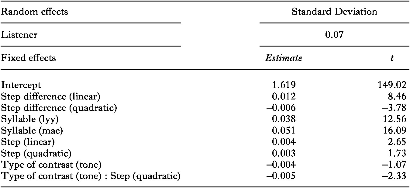 We found main effects of syllable and step difference as well as an interaction between step difference and type of contrast. Participants provided more ‘different’ responses for word pairs that contained the syllables [lyy] and [mae] compared to those that contained [dii], and, unsurprisingly, for word pairs with a larger step difference, which latter effect was larger in the case of the tonal stimulus pairs. The effects of syllable and step difference varied significantly across participants, as shown by the random slopes of these variables for listener.